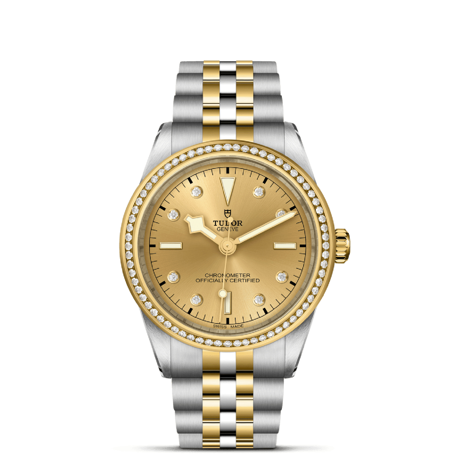First center links in steel or solid yellow gold. Remaining center links in steel or steel covered by a 0.2mm yellow gold cap. TUDOR “T-fit” folding clasp with safety catch. The logo on the catch is made of solid yellow gold