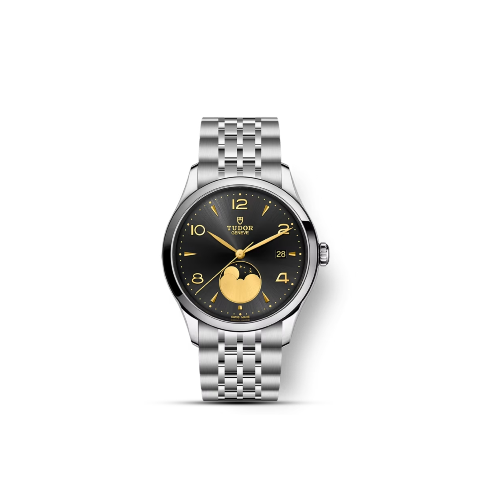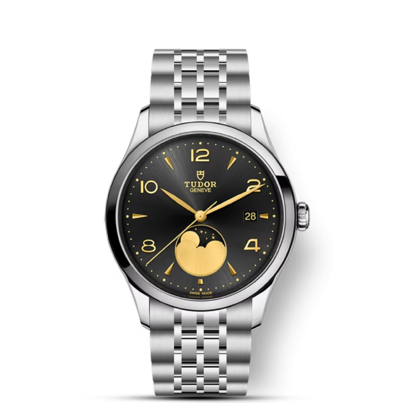 Black satin sun-brushed dial with applied numerals and moon phase indicator